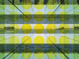 Basing this project on a series of previous experiments with atmospheric density, Eliasson introduces condensed banks of artificially produced fog into the gallery. Hundreds of fluorescent lights are installed in the ceiling as a grid of red, green, and blue zones. By permeating the fog, these lights create walk-through spaces that, in Eliasson’s words, function to ‘make the volume of the space explicit’. The coloured zones introduce a scale of measurement in the gallery, their varying size and organization referencing urban-planning grids. At each colour boundary, two hues blend to create transitional slivers of cyan, magenta, or yellow, and so the visitors will create their own unique colour spectrum when making their way through this seemingly endless space. The artists use this structural marvel to present inquiries into the nature of reality. What should be the basis of our thinking and judgement in a space where reality and illusion interconnect? As we stand amidst such accomplished phenomena, can we re-examine with greater concern our sensations and experiences of that which is around us?