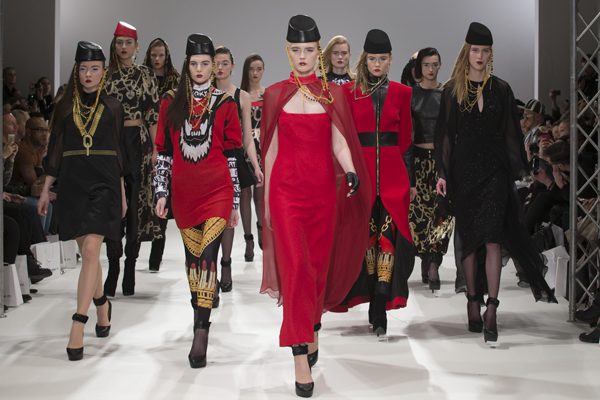 Grandeur was apparent in a precious array of colours, from ruby red to regal gold, with jet black running as a base throughout. Finer details included; height giving pillar box style hats from Awon Golding Millinery, pearl chains and alluring seam back hosiery. Posing a nod towards the brands more playful side, the knitwear carried animated designs such as larger than life jaws and even cute kittens. Referencing the WWI theme, fabrics told of a female meets military narrative. Lipsticks were lined as bullets and gold chains were strapped and swagged on the wearer.