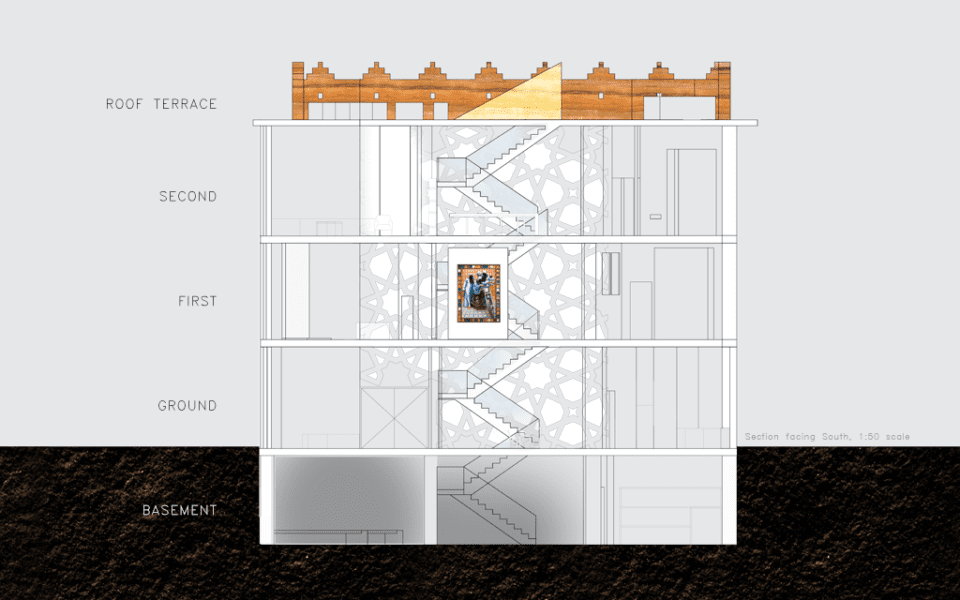 Louna Aissi’s work is not only an effort to design a cultural centre that provides for the existing local Moroccan community of North Kensington, London but also to invite curious visitors with a warm welcome. Golborne Road – known as “Little Morocco” due to its local population and businesses – stretches from Kensal Green to the heavily tourist-visited Portobello Road. From Casablanca’s European art deco touch, to water-permeable vernacular Berber structures to the distinct geometric of Islamic architecture, Aissi examined varying facets of Morocco’s architectural landscape, seeking to reference the country’s various influences. Subverting the traditional inversion of Moroccan buildings (which are inward-facing and lack decorative façade) and opening the ground level with archways and glass façade, Aissi ensured that the centre was inviting and appealing. Dividing the building into levels for different purposes, Aissi set out to provide spaces that could be enriching and educational as well as recreational. The centre holds a café, screening room, exhibition space showcasing Moroccan creatives and a dedicated level for workshops and a study area. The rooftop is evocative of the Moroccan terrace with its wall edge detailing referencing Berber symbols, while a traditional star-shaped fountain and atrium cuts through the structure of the building.
