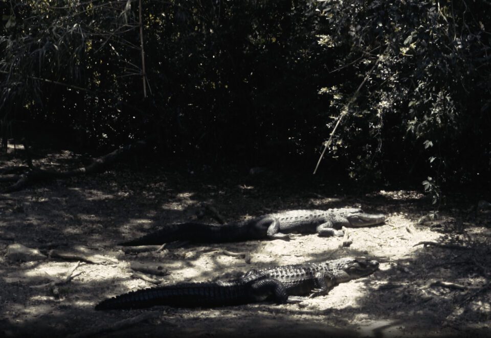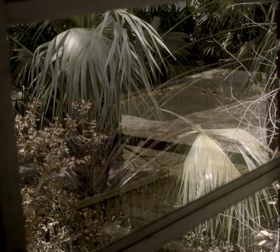 SW: I have been working in Florida for some time, observing and listening to the diverse life forms in a changing and mutating swamp landscape. At the time, I was preoccupied with how a person or consciousness could be embodied. The electric organ helped me think of time as a transfer of energy, entangling me with Lizzy and past with present. I wanted to make a film thinking through the characteristics of sound this way, revealing time as a vibration emerging from relationships, which is how I think about cinema too. Sound doesn’t travel in a vacuum like light, but requires a medium to travel through in order to exist. This produces a particular quality or timbre depending on what medium is being disturbed. I wanted to explore these reciprocal descriptions. Having filmed in the area, I was familiar with some of the existing relations between solid, liquid, gas and bodies nearby and how to find or wait for these to reveal themselves. I started recording and editing through weaving together vibrations from light, sound and the place where Lizzy lived called Sulphur Springs.