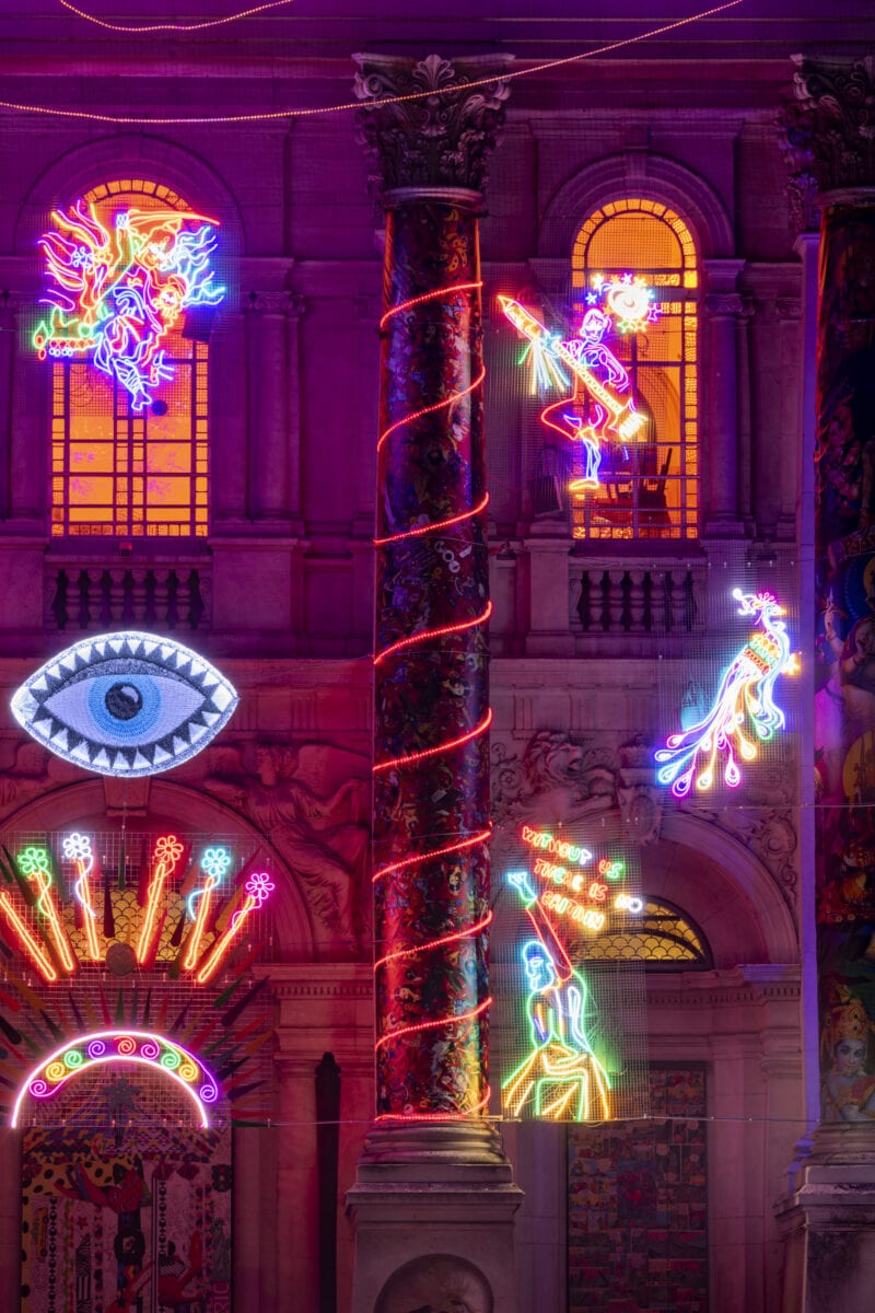 Chila Kumari Singh Burman (b. 1957) is celebrated internationally for her radical feminist practice, drawing on Punjabi and Liverpudlian heritage in multimedia works. For this year’s Winter Commission at Tate Britain, the artist has transformed the front of the gallery building into a celebration of bright lights and swirling colour. Remembering a Brave New World transforms the figure of Britannia, a symbol of British imperialism, into Kali, the Hindu goddess of liberation and power.