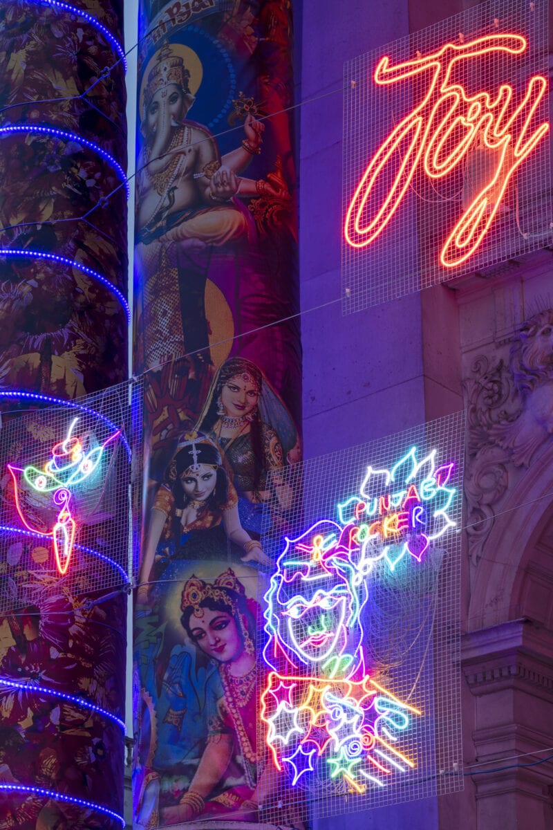 It just coincided with Diwali, it wasn’t deliberate. I was going to put deities on anyway because I like Kali, Shiva, Ganesh and Hanuman. I didn’t have Lakshmi in my remit, but my Indian relatives said Diwali always has Lakshmi and they told me off – so I put Lakshmi in! Then I started to draw them using felt tips, crayons and oil pastels. That’s how it all came about. The only reason all the colours are in there is because the neon fabricator sent me all the colours are available. I just stuck with using all of them. I was dead fortunate because he was white South African and lived in Durban most of his life. I said: “You know you must be familiar with Indian colours because Durban’s the second biggest Indian place after India.” I bet you any money if it was an English person making them, it wouldn’t have turned out the same.