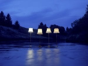 The works are created according to the guiding principle that “balance is key.” He notes: “The relationship between the modern world and nature is rapidly waning. We are moving further and further away from nature and soon will no longer be part of it.” In Reminiscence of us, glowing sticks protrude from a grassy bank, lines of thread connecting the light in a web somewhere between nature and artifice. Guneriussen effortlessly unites objects and places that don’t belong together and makes the process seem authentic: blending into the dark blue hours of the passing day.