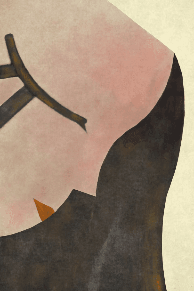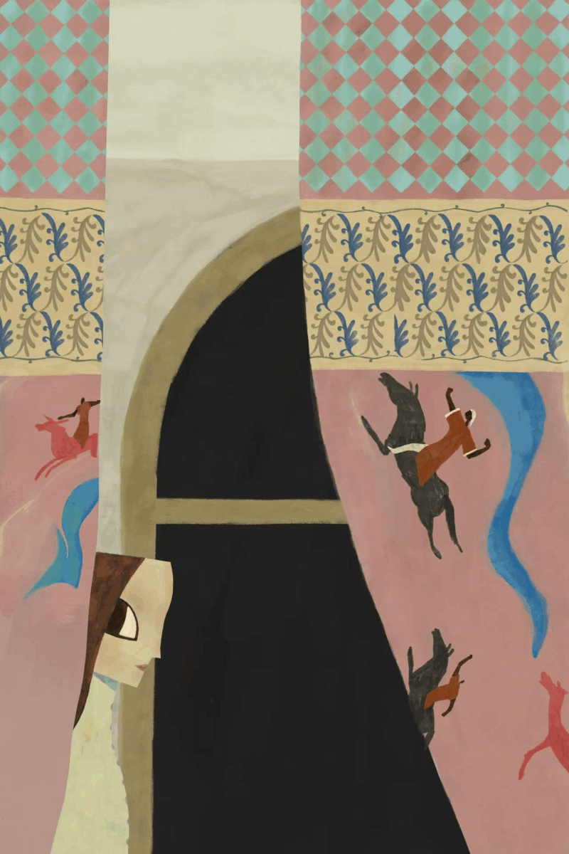 The migrant experience is also central to A Dancer on the Train (2024), an animated short film following a lone figure on a train that never arrives. The work acts as a powerful metaphor: as the character performs repetitive, rhythmic tasks – turning pages, adjusting curtains, watching the passing scenery – the landscape outside shifts and flows “like a stream of consciousness.” Beyond the window, fragmented visual motifs drawn from Zorg’s fieldwork in East London appear: “South Asian kitchens in Forest Gate, geometric Islamic curtains in Whitechapel, the blue glow of gospel churches in Barking, and sailboats drawn from migrant oral memory.” A single protagonist also appears in Zorg’s recent illustration series Anboo (2024), which foregrounds a character of ambiguous identity with no defined species, background or personality.