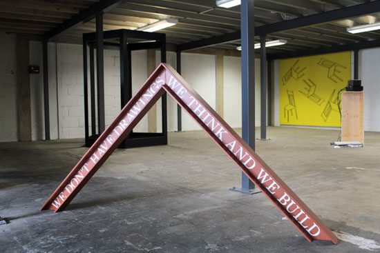 King’s challenge of perception which seems to allow his piece to go deeper in to the ground is contradicted by James Balmforth’s We don’t have drawings we think and we build (2009). It is a rust coloured girder that sits like a pyramid upon the floor towards the entrance. The floor acts as a powerful force that holds this piece in place- seemingly that the floor and the girder are locked in a bitter struggle for dominance of power. However the hidden truth that was in never exposed to in King’s work, in Blamforth’s is revealed. Written on the inside is ‘WE DON’T HAVE DRAWINGS WE THINK AND WE BUILD’. At this point in time and in this location this quote can tackle a multitude of subject matters. Could it be referring to the quickly constructed buildings surrounding the area, or Anish Kapoor’s structure which is an example of how the role of the established artist today has evolved beyond the need to simply create strong two-dimensional works?