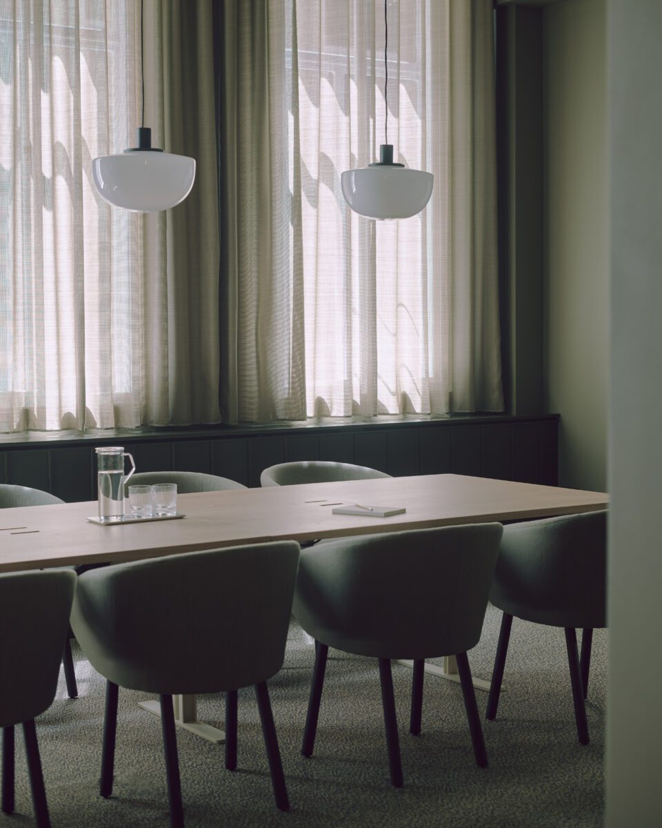 Note formed their concept for Summit House on Swedish Grace, a pre-functionalist style of modernism which complements the original Art Deco foundations of the structure. Natural light seeps in through the windows, alighting warm tones of oak wood, stone, glass and terrazzo. The centrepiece is a segmented reception that almost seems to burrow itself into the wall behind it, making for a striking entrance when first stepping through the doors.
