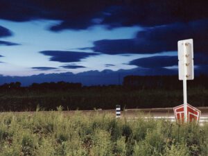 Very little happens in Ghirri’s frames. They are characteristically minimal and measured – offering moments of calm in an ever-quickening world. Couples stroll, hand-in-hand, across lush fields, or are caught off-guard in conversation at beachfronts. His colour palettes are often restrained – featuring bright white, grass green and pastel blue hues against a flattened picture plane. As Curator James Lingwood says: “He does not set out to capture a series of memorable moments, or highlight the beauty or significance of a place, but rather to reflect on a culture defined and shaped by images and their creation.”