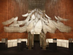 The exhibition translates personal experiences into large-scale pieces. Incorporating objects such as boats, luggage and a burned piano, the show evokes themes of movement, travel and silence. For example, 65 suspended ships welcome visitors to the museum in Where Are We Going?, an installation speaking about an ambiguous future. Uncertain Journey continues this dialogue, consisting of further abstract vessels rendered in crimson thread. Accumulation – Searching for the Destination is made up of around 430 suitcases, reflecting on themes of memory and migration.