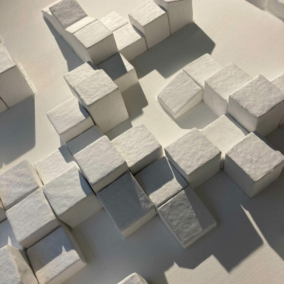 Spheres repeat and fuse together. Cubes stack and twist. Manuel Ursprung creates three dimensional playgrounds for the imagination, expressing memories of daily life and travel. MMXX is made from more than 300 Plaster of Paris shapes, handcrafted over 600 hours. The sculptural wall hanging represents an empty urban landscape, encountered by the artist during a visit to London in 2020. “The people around me didn’t notice the beauty sleeping between the city’s incredible buildings.” Shadows from the miniature apartments dance on a white surface, whilst Ursprung’s handprints transform the scene into an expression of selfhood.