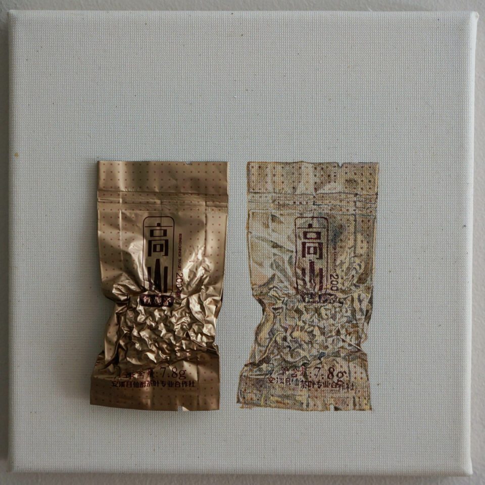 Image Credit: Olga Woszczyna, Oolong Tea, (2021). Ink on canvas and readymade. 20cm x 20cm x 2cm.