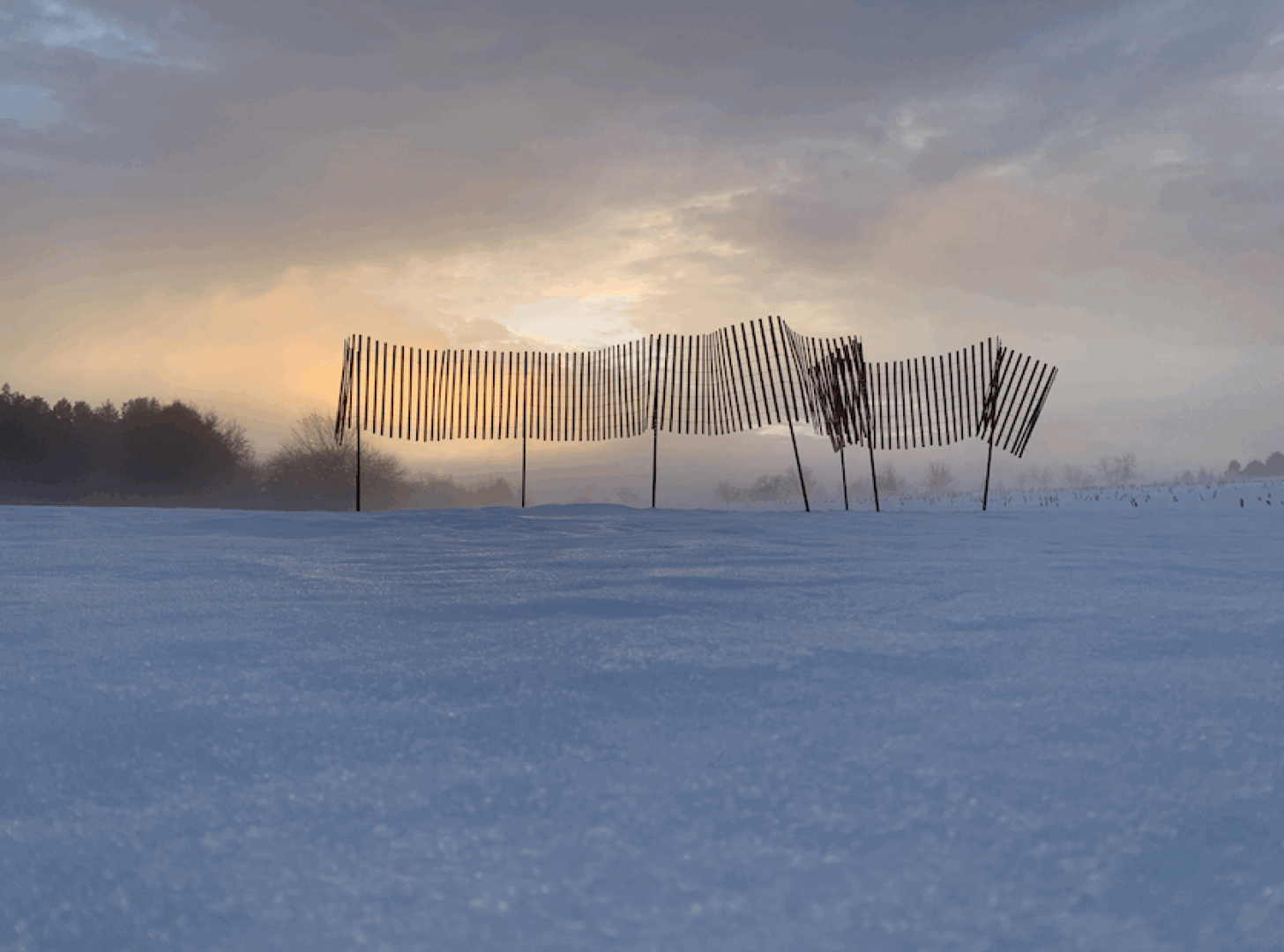 The exhibition encompasses the Great Lakes region, taking as its starting point ancestral earthworks conceived not as static monuments but as living sites of care. Photo and video documentation by Art Hunter presents land stewardship practices at the Kay-Nah-Chi-Wah-Nung Historical Centre in northwestern Ontario – a place of early habitation and ceremonial significance – highlighting controlled burns and other interventions that sustain the site’s delicate ecology. Michael Belmore’s snow fence installation, visible from November 2025 through March 2026, unfolds according to the seasonal cycle rather than the exhibition calendar, while Lisa Myers’ audio work encourages visitors to engage with the land through listening and movement. Alongside these works are contributions from BUSH Gallery (Gabrielle L’Hirondelle Hill, Peter Morin, Tania Willard), Alex Jacobs-Blum, Faye HeavyShield, Mike MacDonald, Edward Poitras, and the Protect the Tract Collective. A printed Engagement Guide offers visitors historical and cultural context, deepening the contemplative potential of the exhibition.