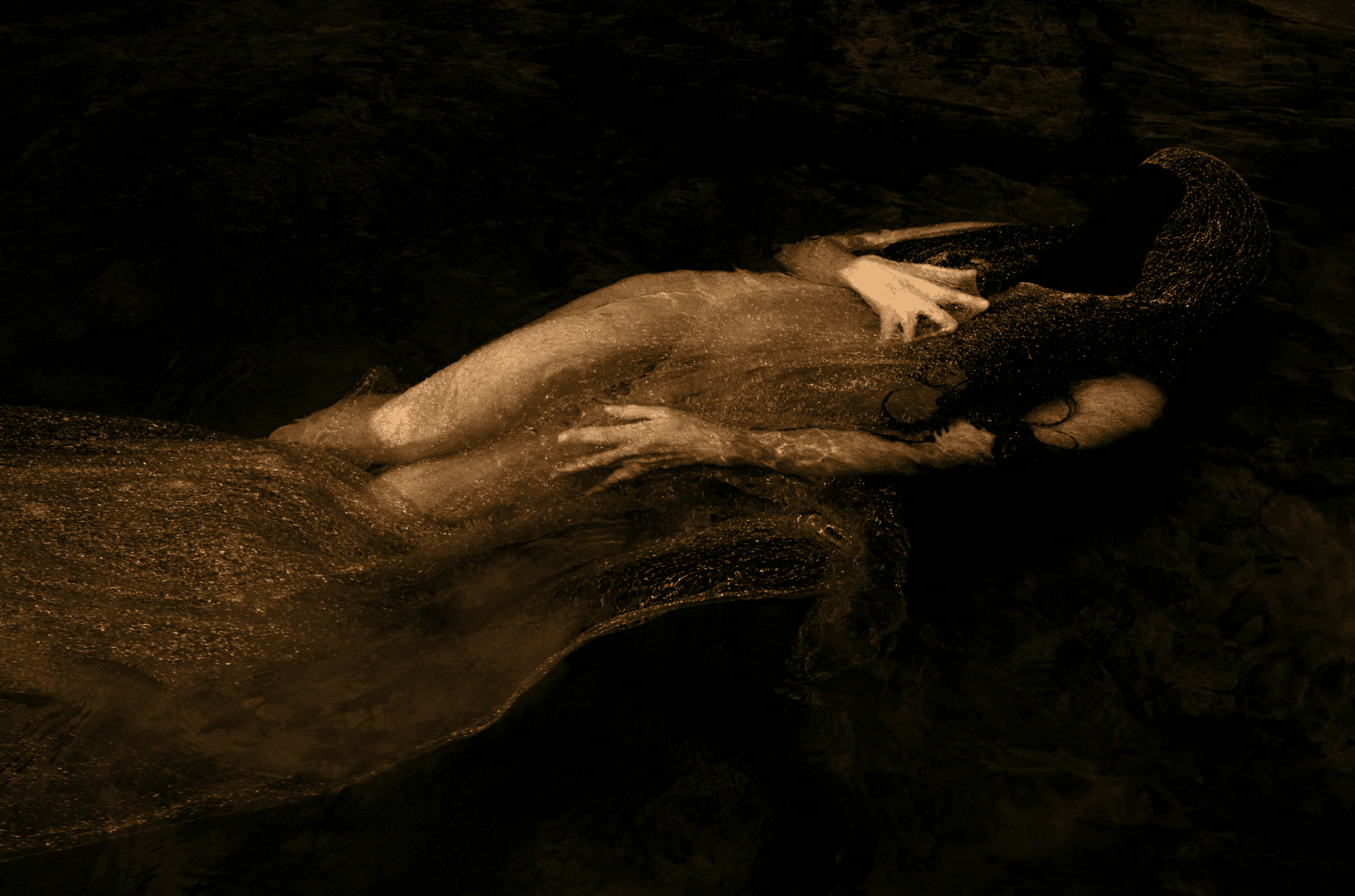 Orpheus (2021) was constructed underwater using shells, fish and flowers. The series of ten large-scale photographs offers a new take on Dutch masterpieces of the 17th century, featuring objects that emerge from dark waterscapes and collide in otherworldly and ethereal configurations. Flowers seem to swim in the darkness, floating alongside jewel-like creatures. Everything is dramatically shrouded by golden nets and sheets of suffocating cellophane.