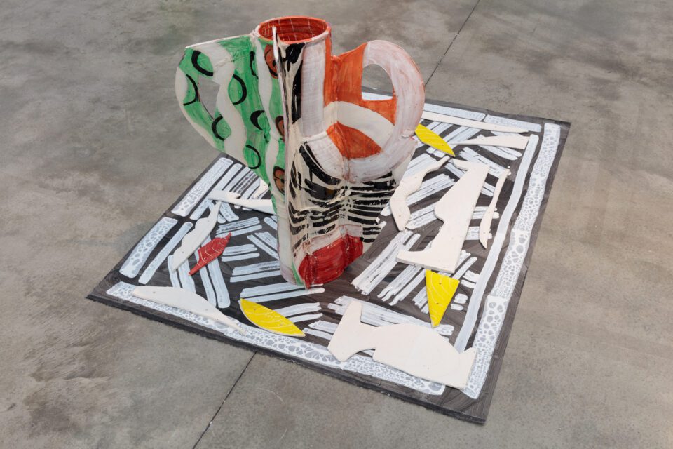 To think of Woodman as a straightforward potter or ceramicist would be deceptive – her works owe a great deal to her painter’s eye, and a concern for context makes her an ally of the installation artist too. While the years spent creating functional, usable vessels still surfaces in her latest works, perhaps what is most radically ‘new’ is her stepping back from this – a movement demonstrated most clearly in her rugs and wallpaper pieces. Wallpaper 9 (2015) lets go of function altogether. Here, the interstitial spaces between flitting coloured offcuts of clay will never contain. Like cooking, Woodman jokes, it’s when you use up your leftovers that you get truly creative.