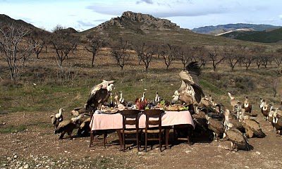 Another stalwart is the time-based work of Greta Alfaro. In Ictu Oculi (2009) unfolds as a static camera documents a flock of vultures descending upon and devouring a lavish banquet laid out on a table in barren countryside. The film is both engrossing and disturbing to watch, as domestic subtly is subjected to brutal animal reality.