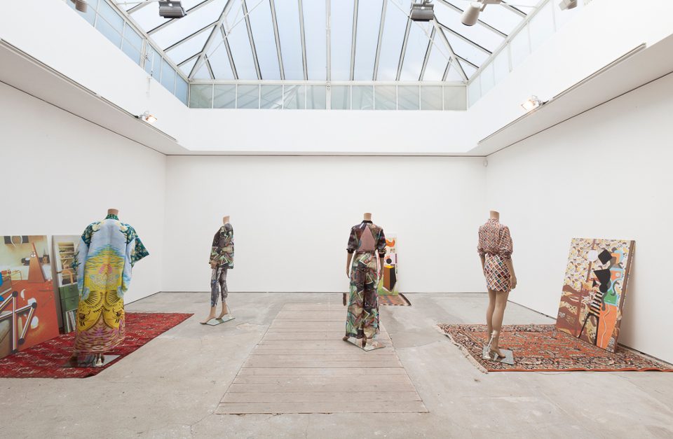 Both born in 1980, the artists have grown up in the tail end of Generation X where by sexual orientation and experimentation, drug addiction and violence have become commonplace earmarks within life to the point of almost being rites of passage into adulthood. This is captured in Lewis’ mark-making which is sharp and unequivocally limited like the foggy memories of a hangover. In Acid Man’s Funeral (2015) a carnivalesque burial becomes a 21st century rival to Courbet’s A Burial at Ornans (1849 – 1850) which at the time caused uproar due to its unflattering realism and vast scale which was usually saved for heroic religious masterpieces. Here, Lewis’s tropes of Nike logos, cigarettes, lingerie and graphic sexual imagery acts within gay culture confront the audience. There will be no uproar. Instead, we have learnt, embraced and progressed. Minoliti’s Textile As Sculpture series (2016) and Vol Rasant – Kimono Printemps (2014) are products of this. The idea of hanging art works on white walls within a gallery is pushed to include textiles designed by other artists.