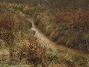 The sole work on the third floor is Untitled (2014). It is comprised of four canvases that run across the majority of the wall and are visible as soon as the viewer enters. The canvases are decoratively layered in peacock feathers. Natural light streaming in from a window to the left of the work and the individual areas highlighted by soft spotlights, sees segments of rich greens and blues dance and twist accenting their colours and thus retaining, albeit in a new fashion, the feather’s primary function to attract. The impact of the sunlight throughout the day, as it manoeuvres across the canvases, weighs deeply on the work, steeping it in a poignant finality, which is highlighted by the works isolation from the rest of the works in the exhibition.