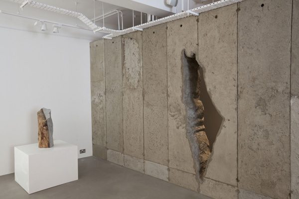 A video shows the artist chipping sections from the real version of this wall with hammer and chisel. The concrete he obtains is used in sculptural works, which in this show take the form of popular sports equipment; items include a football and a discus. Situated on white plinths the objects are grey and leaden and lack any sense of movement or potential. The starkest contrast is provided by a basketball, which in the absence of any elasticity seems sadly impotent. Through these material substitutions the qualities of the concrete are projected back upon the wall from which it was obtained.