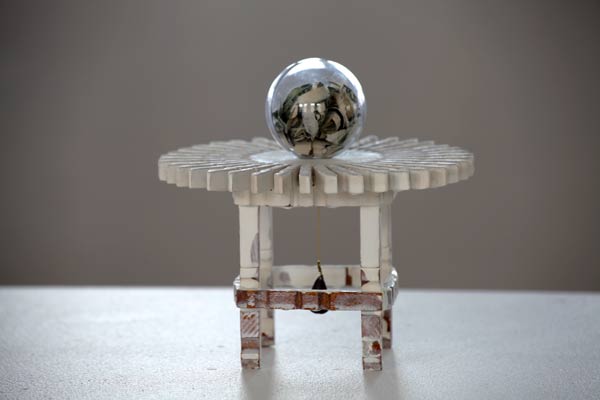 The socio-political affiliations of commerce are questioned by Ni Mhaoilir in the works Culturevator and Main Street. A torn Dollar bill encased in a plastic vending machine ball sits on top of a circular structure constructed from pegs, a golden thread attached to a piece of lead weighs down the decommissioned money. Main Street perhaps represents an economy and a cultural identity that is dependant on America and a foreign power that dictates our successes and failures.
