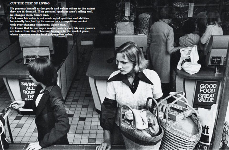 Several captions mimic the blithe, blandly familiar promises of consumer culture. A photograph of a street in an uninspiring new-build estate, peopled only by an old woman doing her shopping, a young mother, and a stray dog, describes a near-fantastical idyll: “Ocean crystal clear. Sea anemones. Turquoise waters. Total immersion. Ecstasy. TODAY IS THE TOMORROW YOU WERE PROMISED YESTERDAY.” Another highlights the flattening absurdity of high fashion’s imperatives, given the realities of class, race, economic, and other differences. A multi-ethnic group of various ages waits for a city bus, while the floating text serenely describes the aesthetic of a Mayfair “lady”, in which “every element is pale and perfect.”