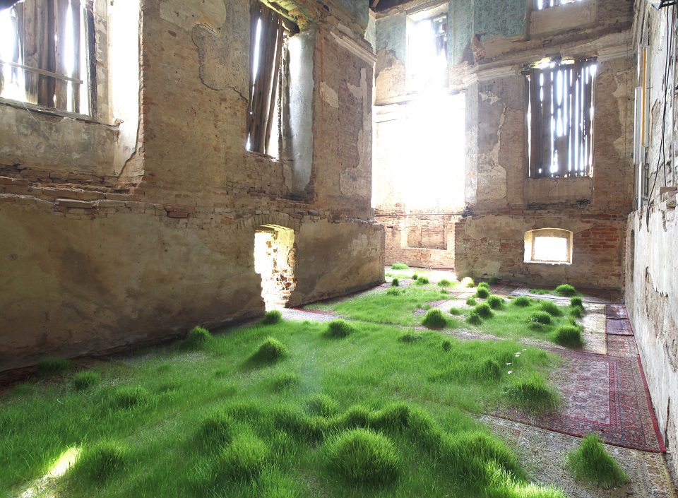 1. Martin Roth, From May to June 2012 I Grew Grass on Rugs in a Castle. Installation shot from Kalsdorf Castle, Austria. Courtesy of the Korean Cultural Centre UK.