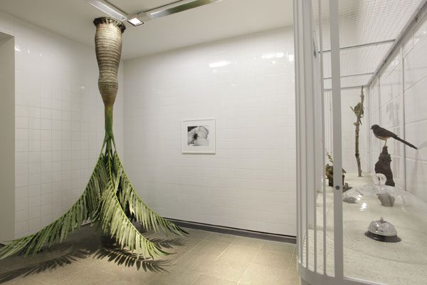 The first section of the show comprises her collections of botanical and zoological artifacts. Especially interesting are the tiny, sketch-crammed books made by Manuel Montalvo in the last century, a collection of ten or so that are filled page to page with studies of animals, insects and natural forms. Equally fascinating are the collections of glass jellyfish from the 19th Century, so delicately made and representative of the real thing, it’s hard to imagine that they weren’t formed in a modern day machine. These works are shown alongside the exhibitions calling card, the photograph of the tattoo covered body by Trockel herself. Look closely and the (at first aggressive seeming) body ink reveals itself as delicately etched flowers. Further into the exhibition is a spine tingling shot of a tarantula climbing over a ladies private parts, in a room also showing a bird cage with a surreal set up, containing three birds that rotate at random intervals and a bell underneath a bell jar. Where at moments you can grasp her works with total clarity, at other times she loses you completely, and this room is where it begins to pull apart. Despite this, she never loses the viewers interest. It is very unusual to visit and exhibition and be able to keep involved with work that at times is beyond comprehension, but her relaxed presentation allows an ease of viewing these works not necessarily with a desire to ‘understand’ or to be informed, but more to get some sense of feeling from them.