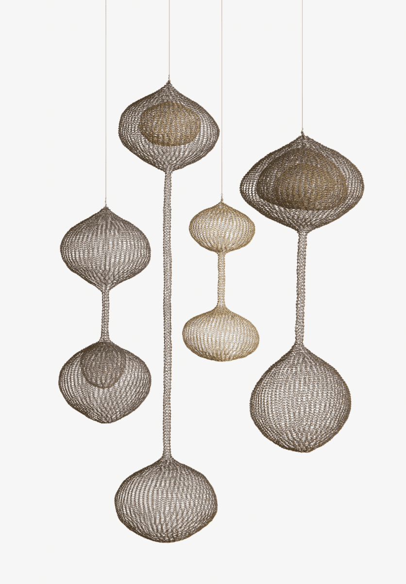 8. Untitled (S.046a-d, Hanging Group of Four, Two-Lobed Forms), 1961. Copper and brass wire, (a): 152.4 × 43.2 × 17.8 cm; (b): 53.3 × 30.5 × 30.5 cm; ©: 81.3 × 33 × 33 cm; (d): 104.1 × 40.6 × 40.6 cm. Collection of Diana Nelson and John Atwater, promised gift to the San Francisco Museum of Modern Art © 2026 Ruth Asawa Lanier, Inc., courtesy David Zwirner; photo: Laurence Cuneo.