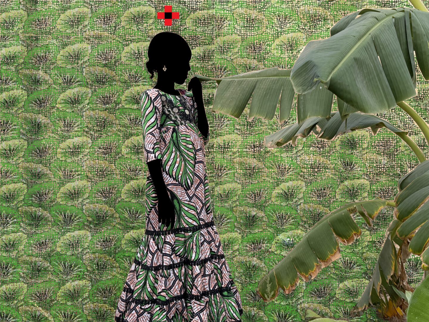 Collage, painting and lens-based media collide in Tracing Shadows, as Dicko paints over his photographic prints. These multidisciplinary works are layered with cultural references. Their backdrops, often replete with flowers and leaves, reference Burkinabè textiles. There’s also a nod to the rich tradition of West African studio photography – think Sanlé Sory, Seydou Keïta or Malick Sidibé. Dicko’s subjects are primarily anonymous children, who wear traditional fabrics, beads and jewellery. As such, the idea of play and imagination is central: these are young people with their lives ahead of them, who look to the future whilst honouring symbols of ancestral memory and identity. Sharp-eyed viewers might spot the black and red cross painted overhead – a motif often seen in the traditional rugs of Dicko’s youth.