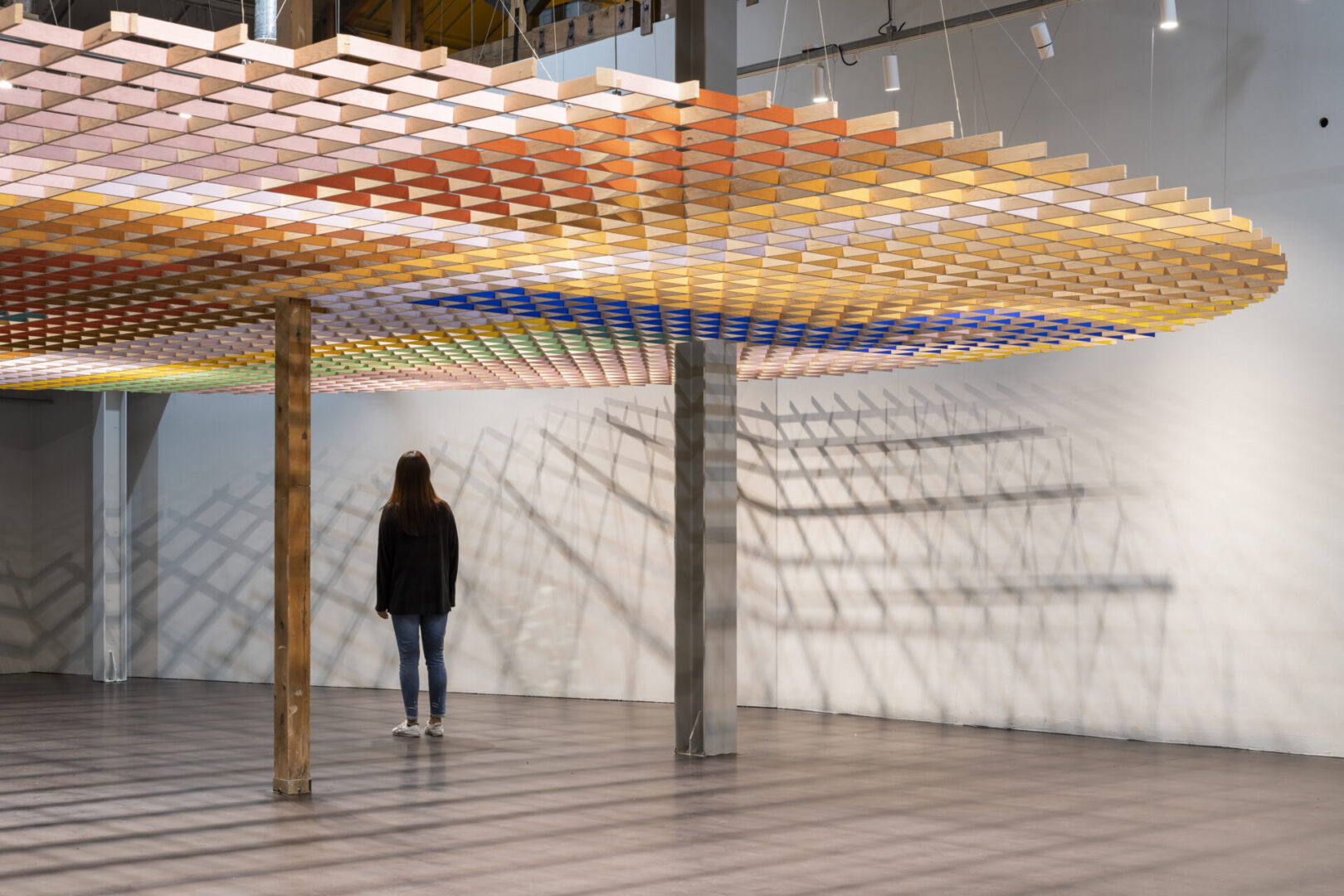 The exhibition’s namesake work, SPAN (2025), is realised through collaboration with Suyeon Kim, a master of dancheong – the traditional Korean art of architectural painting. Here, the ornate patterns are distilled into a contemporary composition, reimagined as a series of brightly coloured lines. In SLOW WATER (2022), this chromatic language extends into an elevated floor installation made from interlocking wooden slats, inspired by Munsal, the latticework found in Korean architecture. The vivid palette and shifting perspectives invite movement, echoing the layered rhythms of oral storytelling and communal labour.