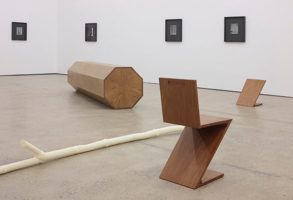 Somewhat younger is a plank of 45,000 year old Ancient Kauri wood, pickled for millennia in a New Zealand swamp, and here transformed into 9ft of Gerrit Rietveld’s Zig-Zag Chair (a still-futuristic design from 1932-34). Together with an octagonal oak housing, a powerful reflecting telescope, and a copy of a birch branch – which, unlike the petrified tree trunk, was deposited layer by layer in a matter of hours in a high-tech 3D printing machine – this collection of objects begins a conversation with the artworks from the recent past of the exhibition space reiterated on the mirrored surfaces of the Recursive Plates.