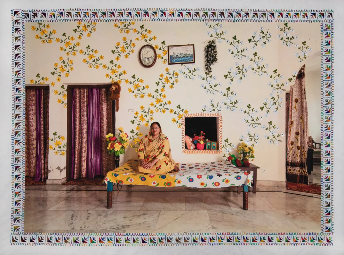 In Rukmesh Kumari IV (2023), yellow petalled flowers spread across a back room. They climb up the walls, sprouting from curtains and picture frames, creating a verdant, floral backdrop. In Parween Devi III (2023), saffron and scarlet stitches surround a mirror. They draw the viewer’s gaze to Parween, who sits on a stool, facing her reflection. To the left, we see an enlarged lock on a closed door, a small indication of the domestic cicrumstances at hand. Elsewhere, in Jyoti (2023), a woman is tethered to her mirror image by a series of gold threads, inextricably linking the two bodies together. Produced in dialogue with many collaborators, the series showcases the unique preferences, desires and fears of the women who comprise the collective. More than this, the pieces also challenge what Malik refers to as the “colonial lens.” She notes, “I have a problem with documentary work done in India for the last few decades. It usually shows a western perspective — high-profile photographers would come and do grandeur projects with rich contrasts and beautiful images of poverty.” In contrast, these are images that focus on individual and regional weaving practices — Chikankari in Lucknow, Zardozi in Jaipur, and Phulkari in Punjab. Malik pays attention to individual desgins; each composition prioritises the self-determination of its subject.
