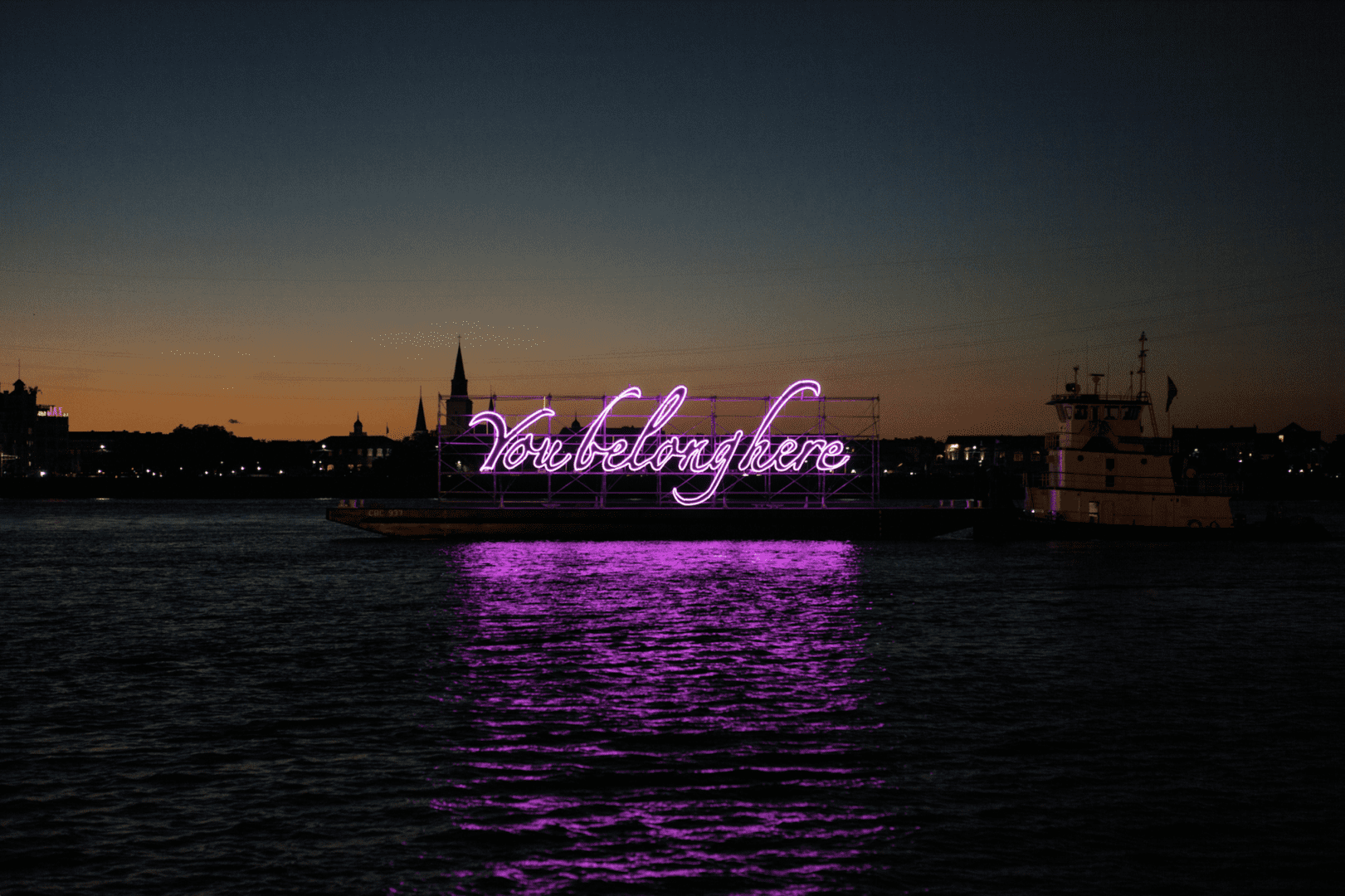 - Tavares Strachan, You Belong Here, Prospect 3 New Orleans, 2014. (Installation view from Prospect 3 Biennale, New Orleans, LA). Blocked out neon travelling installation on the Mississippi River. 30 ft x 80 ft on 100-ft barge. Courtesy of the artist, photo & video by Joe Vincent Grey.