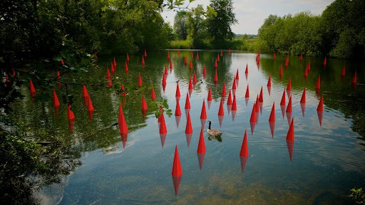 The rhetoric is hard to keep up with at times, but the works speak for themselves. Opening tomorrow, August 18, is a major commission by environmental artist Steve Messam. This work, entitled Seven Spires, sees seven 4-metre high red spires installed in the Oxford Canal on the approach to the Grand Union Canal junction and the historic narrow boating village of Braunston. Exploring both the county’s relationship to its canal network and its long standing reputation for being the county of spires and squires, Seven Spires uses solar technology and LED lighting to transform the landscape.