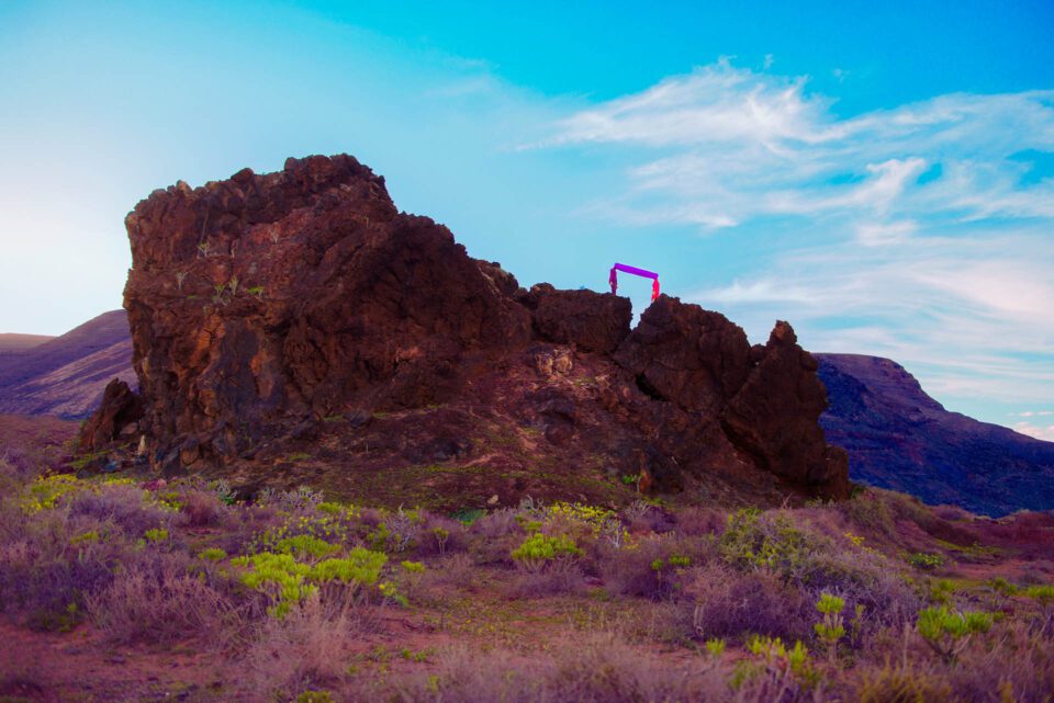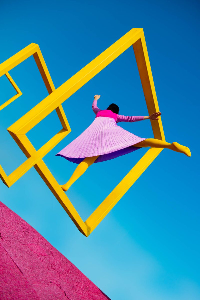 Sanja Marušić (b.1991) is a Dutch-Croatian artist, based in Amsterdam, who builds otherworldly images in which collage, painting and photography collide. The artist travels extensively, capturing performances where figures – often Marušić alone in costume, sometimes accompanied by others – move through surreal landscapes. Mirrored cubes, triangle headdresses and glittery bodysuits create a space-age look and feel. Subjects navigate pink and turquoise flower fields, as if traversing the surface of a new planet, or leap through giant yellow squares, revelling in freedom and play – like completing a video game level. Some of Marušić’s stories are autobiographical, whilst others evade explanation. Folk and naïve art are wellsprings of inspiration here, influencing composition and palette. Ultimately, vivid hues are her hallmark. “By using colour, you can tell a story, but you can also focus attention,” she says. sanjamarusic.com | @sanjamarusic