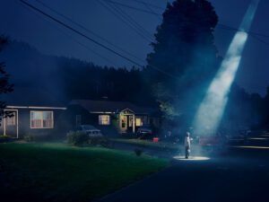 Summer Lovin’ also features work by Julie Blackmon (b. 1966). In Flatboat (2022), from the series Homegrown, children gather around a platform in the centre of a picturesque lake. Balanced on a box, a girl stands tall in the centre of the frame and gazes up at the clear sky. In an interview with KCUR 89.3, Blackmon explains that her photograph was inspired by a piece from American painter George Caleb Bingham (1811-1879), The Jolly Flatboatmen (1846). The resemblance is immediately noticeable. In the painting, a group of men watch a figure dance on a box in the middle of a near-identical platform, on a similar body of water. These comparisons reveal the careful staging that goes into making scenes that look effortless and carefree. As i-D’s Emma Russell describes, Blackmon’s photography only seems spontaneous. In reality, it is “meticulously planned, thought out and orchestrated”. Thin Mints is from the same series, showing a band of youngsters walk in single file across the road – reminiscent of The Beatles’ Abbey Road cover. In Stock Tank, five children swim inside a container usually used as a drinking place for cattle and horses. Cheeky, joyful yet bittersweet, these images present summer as a backdrop for growing up.