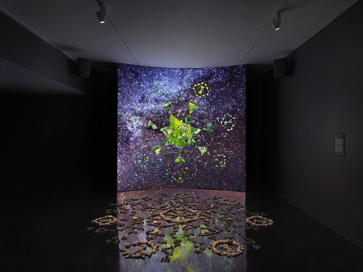 2. Kite, Wičháȟpi, Wóihaŋbleya (Dreamlike Star), 2024. Multimedia environment with video, sound, stones, mirror; 21:16 min. Site-specific dimensions. Photo: Dario Lasagni, courtesy of MIT List Visual Arts Center, Cambridge, MA.
