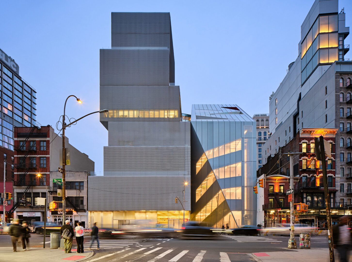 New Museum describes itself as “Manhattan’s only museum devoted exclusively to contemporary art.” It reopened last week after a 60,000-square-foot expansion, envisioned by Pritzker Prize-winning architecture firm OMA. The project was headed by Shohei Shigematsu and Rem Koolhaas, in collaboration with Executive Architect Cooper Robertson. When New Museum was founded in 1977 in a one-room office, it became the first contemporary art institution established in New York since WWII. But it wasn’t until 2007 that its first purpose-built space opened. That structure was designed by SANAA, founded by Kazuyo Sejima and Ryue Nishizawa. Their flagship building – constructed on a former parking lot on the Bowery – is an icon of the Lower East Side, resembling a series of blocks stacked on top of one another. It included five floors of galleries, a theatre and a Sky Room with panoramic views of lower Manhattan.