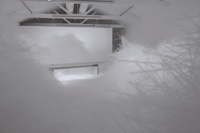 In promoting this exhibition, Sherman Contemporary have kept relatively tight-lipped about the actual components of the installation and for good reason as the surprise visitors experience when entering the space is critical to its appeal. Without wanting to spoil the experience for others, it’s perhaps enough to say here that in the alchemical hands of Yoshioka a very ordinary, everyday material is imaginatively employed to construct a spectacular sensory environment of metaphysical dimensions, sending the visitor on a journey not unlike sifting through clouds or meandering through an enchanted fairytale forest. The form of the installation reflects the exhibition’s overall concern with meditating upon water as an effervescent natural phenomenon, endlessly delightful in its capacity to assume a multiplicity of states – evoked here as vapour, ice and liquid, as well as the various emotional registers the substance can strike in us.