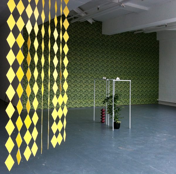 A pebble mosaic-covered sculpture resembling a meteorite reverses the story of Hale’s Brick Moon whilst silently sitting on the floor. Without walking much further, the naturally turning and twisting yellow diamond shapes in a single line of nine hanging from the ceiling appear against the backdrop of the windows. In the dark they appear, and in the light they become partly invisible. The mind plays tricks as the gallery space becomes a planet of its own. An umbrella plant, probably of the Schefflera dwarf variegated variety is, the only living, breathing element standing under a three legged triangular tall table. The second tall table shelters what looks like a tower of pyramids in maroon-red. The table tops carry a stone that looks like it could be moon rock. A large wall is covered with the digitally printed repetitive imagery of intermingling leaves. Nonagonal and hexagonal wooden frames recline against the walls of the gallery space.