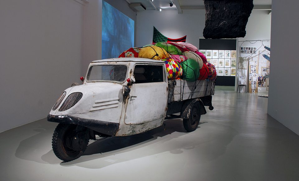 In the main hall, Nauman’s suspended chair gives way to a greyscale image of a woman with her back to the viewer holding a chair frame around her hips in Annika von Hausswolff’s Live from the Ocean (2005). The work refers to Philosophical Chair (2003), on which von Hausswolff commented: “It has stepped out of its existing role, as a chair that you sit in. Partly, it has no seat left, and partly, it floats, it has surpassed itself, you might say.” This idea is visualised in Miri Segal’s video Downcast Autumn Day (2004); city scenes projected on a screen. A pool of clear liquid seeps out from the bottom reflecting the video and communicating the relationship between mediated reality and common reality. Concurrently, Kimsooja’s Bottari Truck (2005) packed with cloth bundles used to carry possessions during periods of migration, transfers the mediated image into an object, bringing the realities of political and economic refugees into the gallery space.