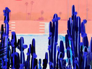 Davies’ latest exhibition, Calypso, conjures up a world of Aus- tralian tropical kitsch. In one image, a figure stands by a pool, their upper body disappearing into a swirl of bubble-gum pink foam shapes. Elsewhere, Davies’ tattooed legs emerge from a tangle of lurid green inflatable crocodiles. This is beach-side fun dialled up to the maximum. Calypso is a celebration of visual abundance and excess, yet at its core lies a serious reminder: the self is not fixed. It is an act of invention, a statement of identity in a world that too often fails to see people for who they truly are.