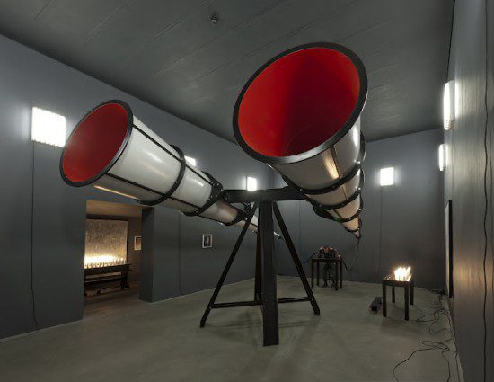 The gallery is divided into two distinct spaces relating most closely to a church and side chapel. In the “nave” of the church multiple components become Polymorphous Oratory (2012). The largest and possibly most bizarre of objects in this room is a conical system of two larger than life ear cones (pictured) attached to headphones on a pedestal at the rear of the gallery space. This puzzling contraption encourages visitor interaction, but listening through the headphones does little to elucidate the purpose of the object. A steady hum of visitors is perforated by occasional clarity of sound, but in general the cones, generally used to improve hearing, only serve to distort sound and perception.
