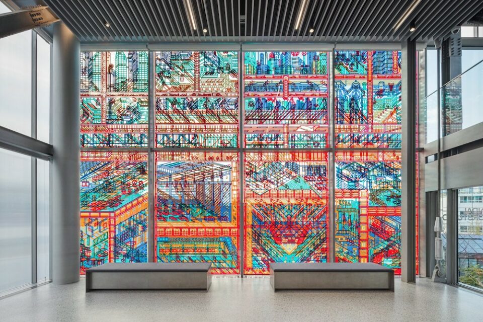 Cabinet of Curiosities by Beijing-based Drawing Architecture Studio is a site-specific architectural drawing. It recreates the surrounding landscape of Hyundai Motorstudio and the city of Busan, inspired by the traditional Korean still-life genre of chaekgeori. The multicoloured design can be seen from both inside and outside; an eye-catching, contemporary stained glass window.