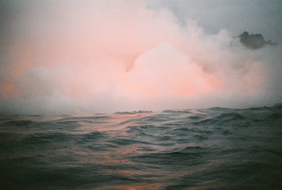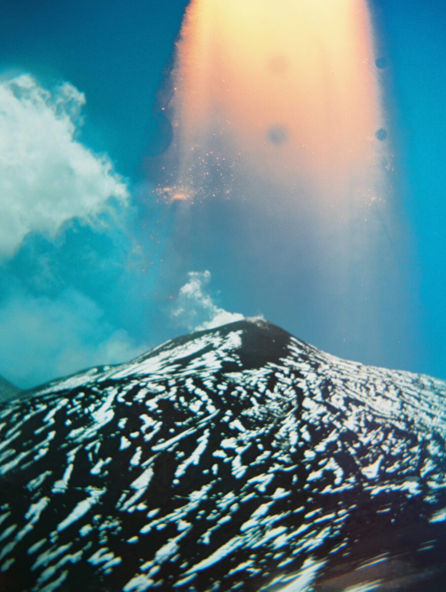 A standout of the show is Halperin’s “field study” photography. These images offer impressions of stunning locations around the world, including volcanic regions such as Big Island, Hawaii; Sakurajima, Japan; and Mount Etna, Sicily. Made with an analogue Holga medium format camera, they carry the unpredictability of film: light bleeding in from the edges of the frame, layers of unexpected colour and a grainy, tactile texture. The ephemeral nature of the medium echoes the themes of the exhibition, inviting viewers to pause and reflect on a singular, fleeting moment within the vast history of the landscape. For the first time, 36 of these photographs, taken over 25 years, will be on display at Fruitmarket.