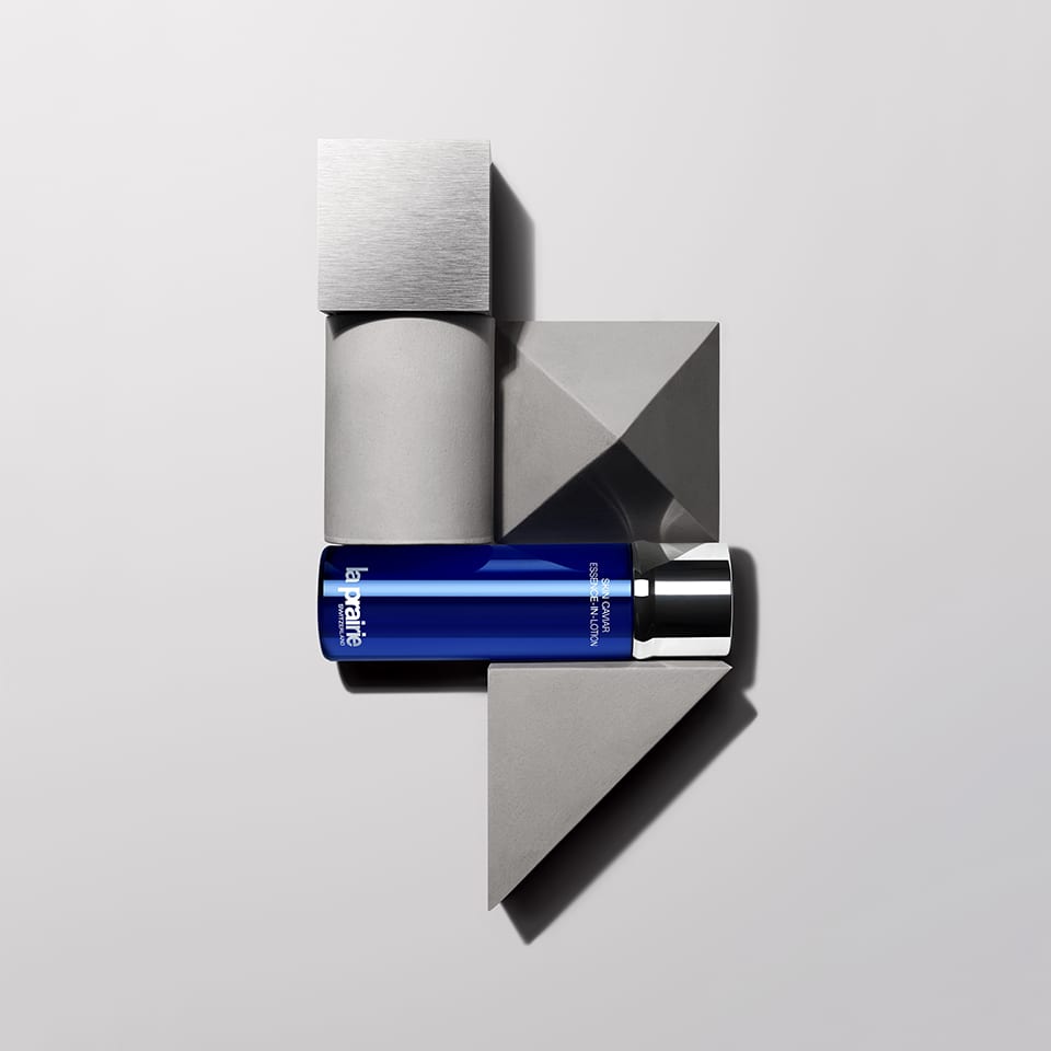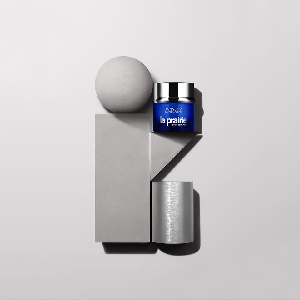 The school’s influence – which is deeply connected to Switzerland – is evident across La Prairie’s range. “In the dialogue between form and function, less is more,” the brand notes, highlighting the value of simplicity. Geometric shapes can be found in its minimal jars and vessels. Pyramids, cylinders and cubes stack against each other in the featured images – creating harmonious compositions. This sense of timelessness is at the heart of what La Prairie does – from rigorous product research to precision-designed packaging and seamless in-store experiences. “La Prairie seeks to transport those who enter its world to a place where time stands still, a place where beauty – just like art – transcends the ages,” they explain. Clean lines and abstract shapes come together, punctuated by a flash of signature deep blue.