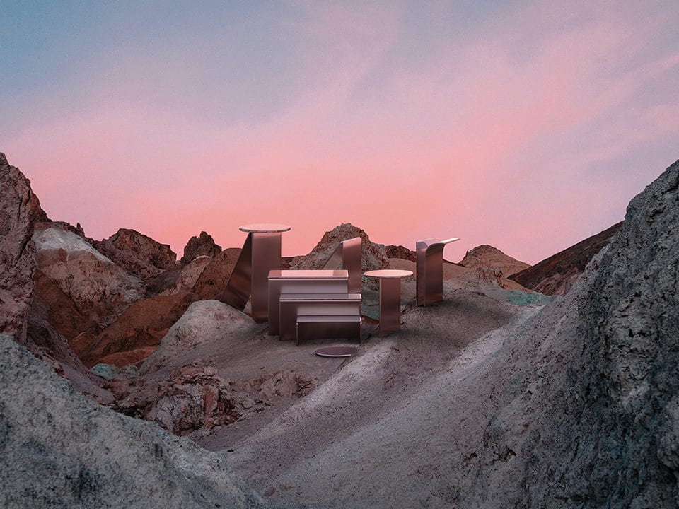 The Co-Existe series is a collaborative project realised with Six N. Five design studio, photographer Cody Cobb and spatial designer Ben Willett. The project was fuelled by a shared love of finding tranquil moments in an otherwise chaotic world. Each image carries a consistent design – a serene and polished visual language that envelopes and calms the viewer. One-of-a-kind sculptures nestle into their distinct environments, which complement each other in form, colour and material. Rust-orange shapes stand out against bright white cliffs. Pink sunsets reflect off smooth silver metal. Iridescent white light bulbs pop against the shadows of rock formations. These images settle the mind through magnetising simplicity, drawing onlookers into glossy lakes and pearly skylines. Six N. Five – directed by Ezequiel Pini (b. 1985) – specialises in still life visuals and videos with a clean and modern aesthetic. sixnfive.com.