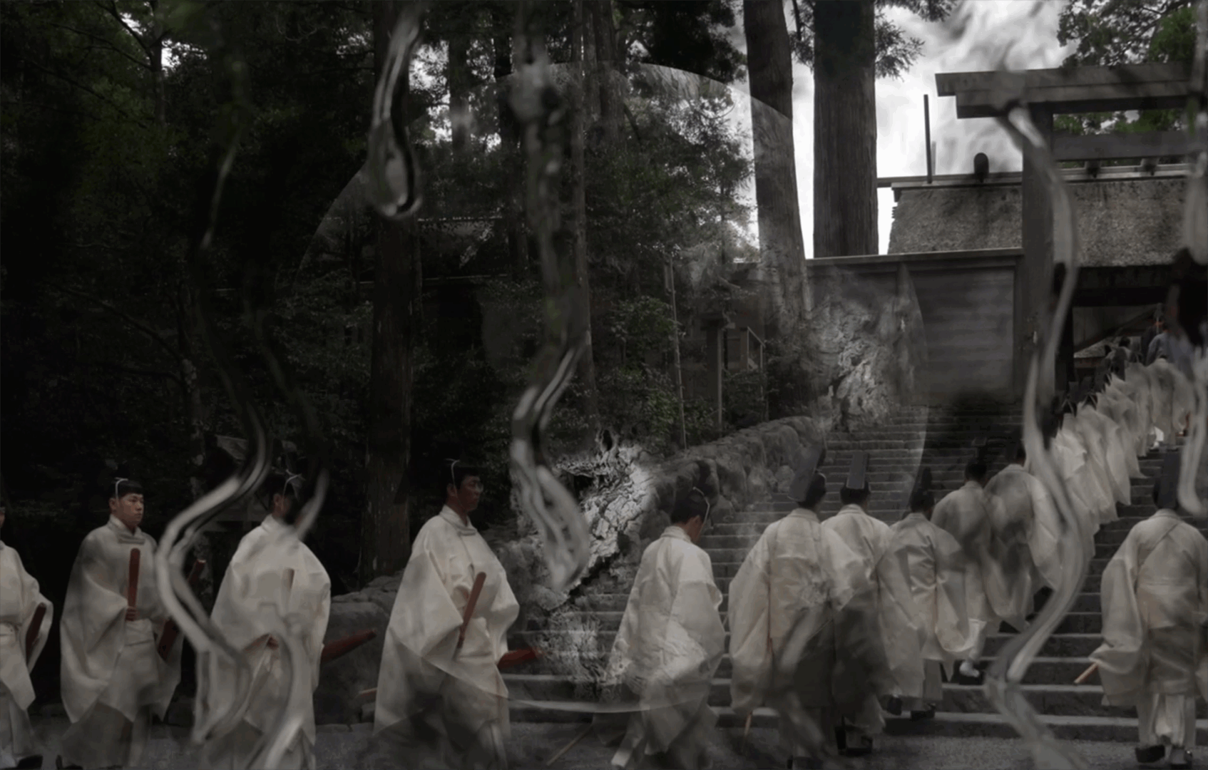 At the centre of the installation is a newly filmed work featuring the Ise Ondō, a traditional female folk-dance collective dating from the Edo period. Filmed with unprecedented access to the sacred precincts of Ise Jingū, the dancers move through ancient cedar bridges and gravel courts in circular choreographies that evoke cycles of planting, harvesting, worship, and renewal. The film is projected onto a suspended mirror – a polished disc that splits reflection and projection front and centre – while a second channel cascades across a lash of LED screens that resemble both liturgical veils and digital membranes. This duality of projection and reflection frames duality itself: gender, centralisation and concealment.