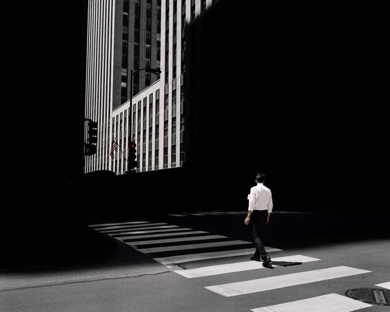Hopper has had a huge influence on Clarissa Bonet’s (b. 1986) photography. She captures real-life and imaginary scenes in the style of the painter’s canvases. City Space was shot entirely in Chicago, although Bonet never directly references the location by name. Its crosswalks, skyscrapers and architecture are the studio for these meticulously staged photographs. Audiences rarely catch a glimpse of her subjects’ faces; instead, individuals are depicted from behind, or bathed in shadow. Bonet’s isolated figures highlight a tension between physical proximity and the emotional distance felt by many residents living in metropolises.