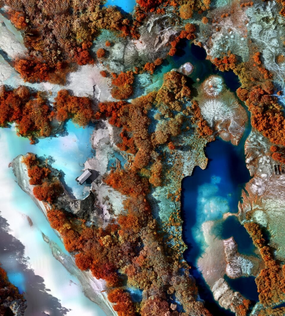 Again mesmerising and disturbing, the photographs show refugees travelling on routes into Europe as ghost-like figures. They force the viewer into an uncomfortable position, revealing the dehumanising way migrants are treated and portrayed. The series is part of a wider conversation into the ethics of the genre, with critics asking whether certain types of imagery contribute to the ‘othering’ of those depicted. More recently, Mosse has turned his lens from social to environmental issues. He travelled to the Amazon rainforest in Brazil to shoot Ultra and Tristes Tropiques, using UV fluorescence and satellite imaging technology to show – from up close and afar – a region that is enduring catastrophic levels of deforestation. The jewel-like portraits of plants and psychedelically-tinted land mappings create the same sense of wonder found throughout Mosse’s work. As elsewhere, that appeal reveals troubling realities.
