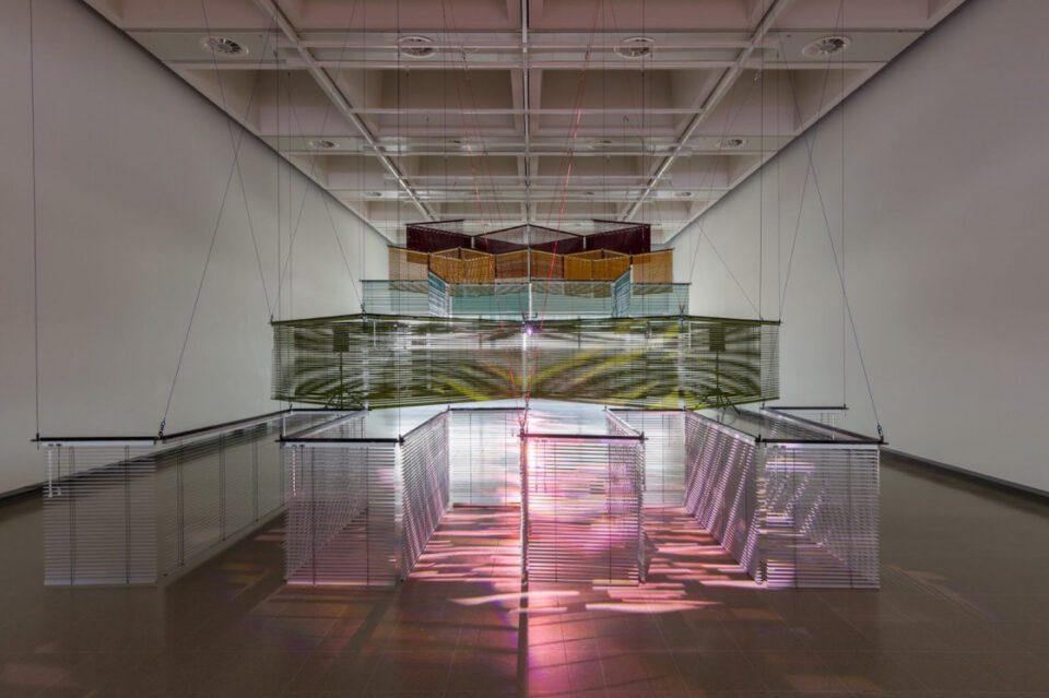 Haegue Yang describes her work as “incubated abstraction,” drawing on specific historical narratives and figures to create large-scale installations. Star-Crossed Rondezvous brings together two major pieces made with venetian blinds, a window treatment designed with adjustable angled slats that filter light and structure spatial relationships. On one side of the exhibition, Sol LeWitt Upside Down – K123456, Expanded 1078 Times, Doubled and Mirrored (2015) is a monochromatic structure inspired by the cubes of American conceptual artist Sol LeWitt, whilst Star-Crossed Rendezvous after Yun (2024) pays tribute to the life and work of Korean-born Isang Yun, a pioneering composer and political dissident.