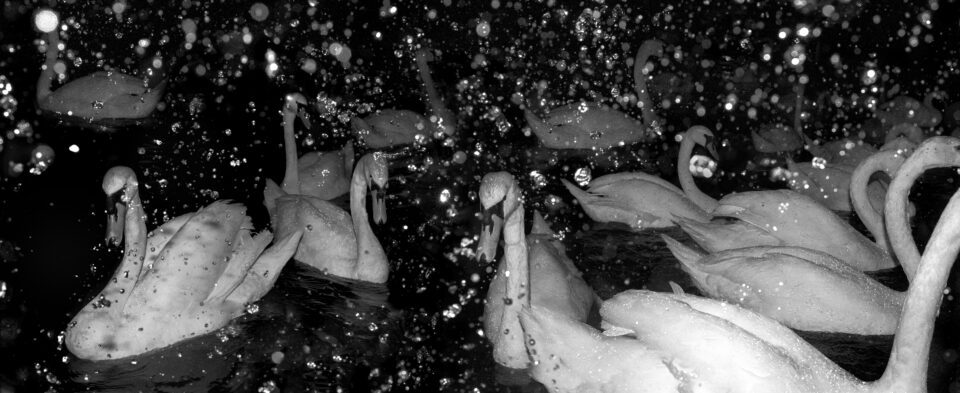 Ten Thousand Drops of Rain (2025) positions raindrops as a fragile unit of measurement. Pan used high-speed photography and microscopic lenses to isolate individual beads, each one only existing for a moment. She says: “They form a rhythm: one drop, two, eight, ten…until it rains, counting itself fails and dissolves into pure phenomenon. This sequence reflects ancient cosmology where one begets two, two begets three, and three begets all things. But where philosophy imagines expansion, I observe disappearance: the more we try to measure the world, the more it escapes our grasp.” One particularly poignant image, A Drop on a Swan (2025), captures the transient yet intricate interaction between a single droplet and a swan’s feather. The bead sits at its edge, perfectly spherical, appearing almost to defy gravity – a moment held still just long enough to be seen.